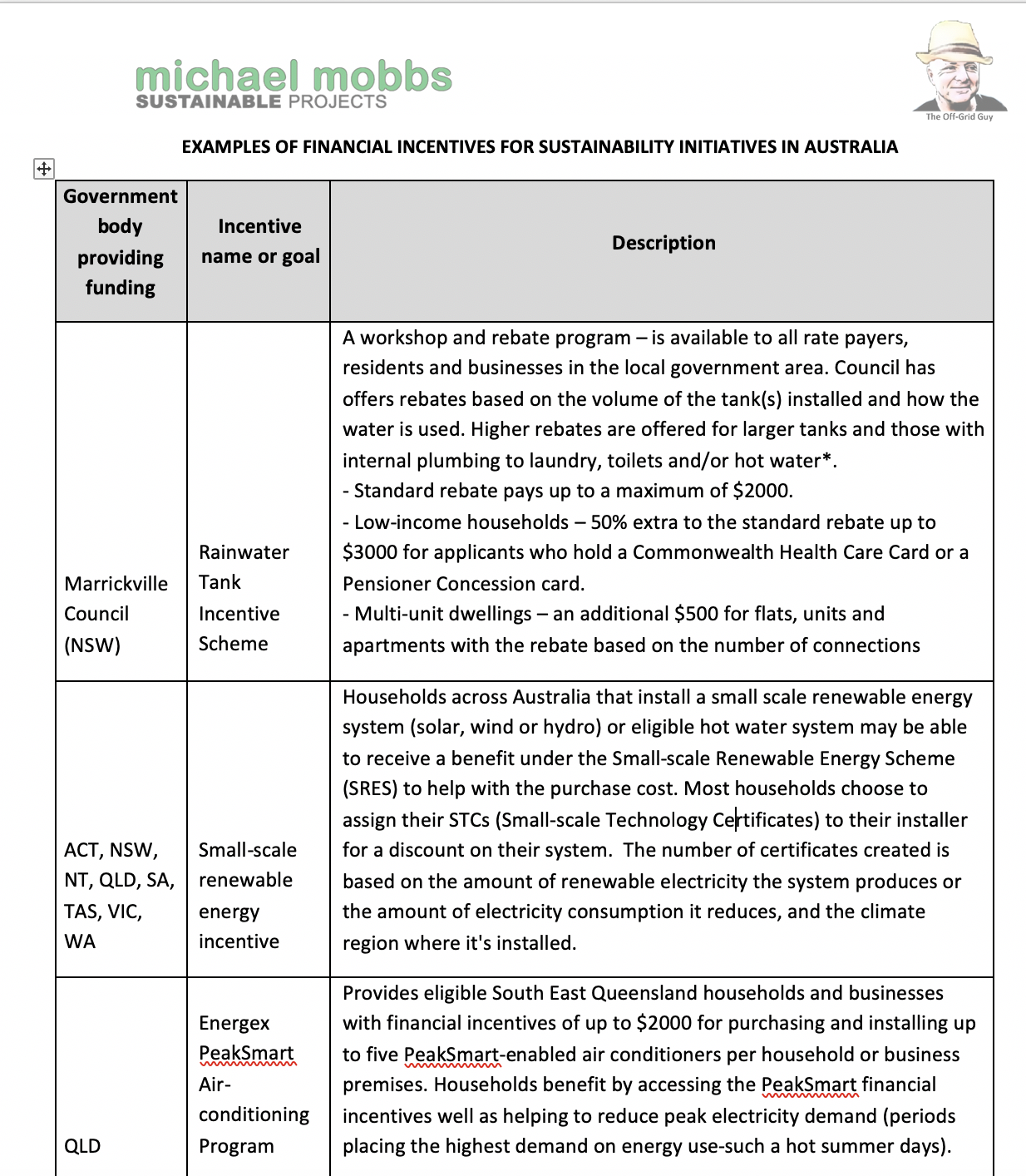 Here is a list of some but not all financial incentives offered across Australia by local, state and federal governments, and aimed at sustaining energy, water and land resources.