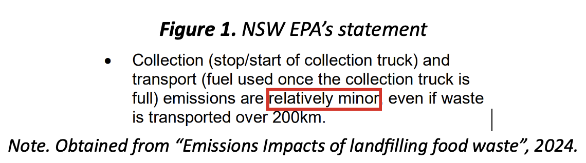 Still, I broke down NSW EPA’s statement and got into the details. I discovered their words came from the work this consulting company called Blue Environment Pty Ltd did for them back in 2023 [2]. Blue Environment, I supposed, was tasked to quantify the lifecycle emissions of food waste when it is disposed of in many different ways, such as the famous “Business as Usual” and “FOGO”, so NSW Councils could make informed decisions regarding their food waste disposal—good stuff by NSW. Unfortunately, the more I looked into it, the more I looked into transport emissions, the minor inconvenience rolled and rolled to something that couldn’t be ignored any more.