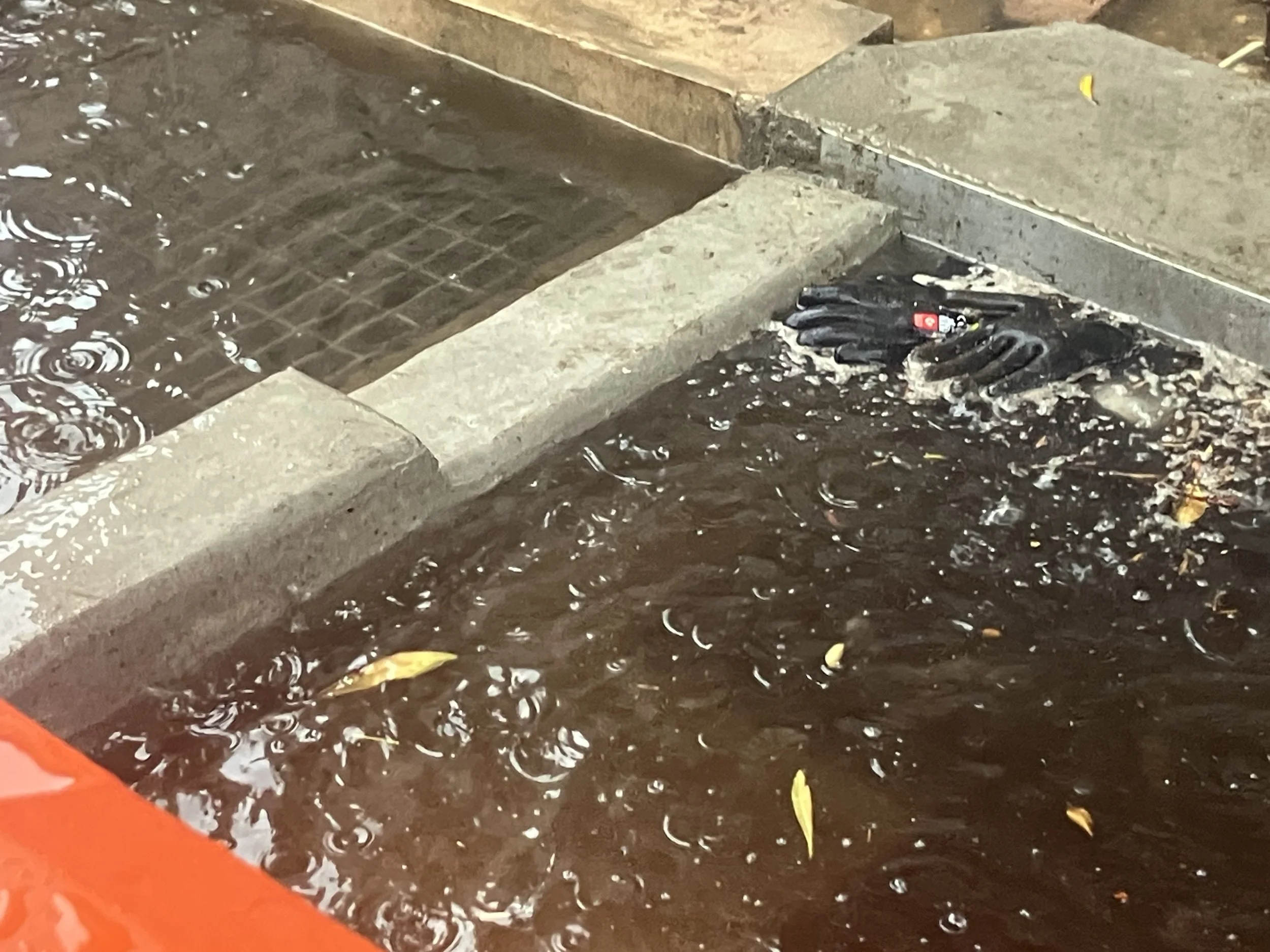 (Photograph taken 2 August 2025 during several consecutive days of rainfall during which the water may answer those who may look and ask, “What the truth is about these rain gardens? Do they work?” - to which the glove says . . . “No”.)