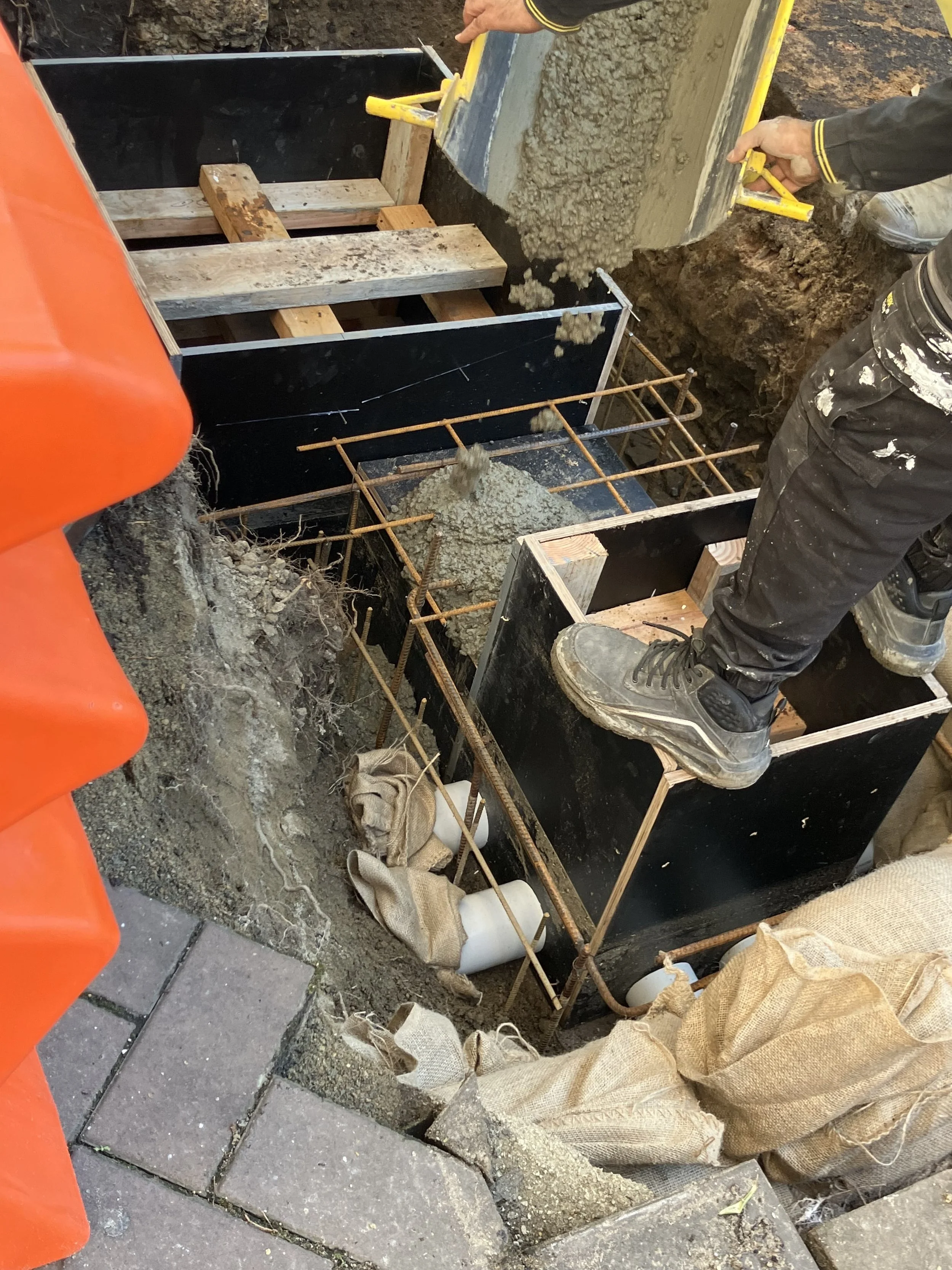 • July 2025 - Concrete pour around pit with six pipes at base of pit - hessian sacks in pipes are to prevent concrete blocking the pipes; the pipes are intended to discharge rain to soil about 1 metre below the surface of the ‘rain garden’