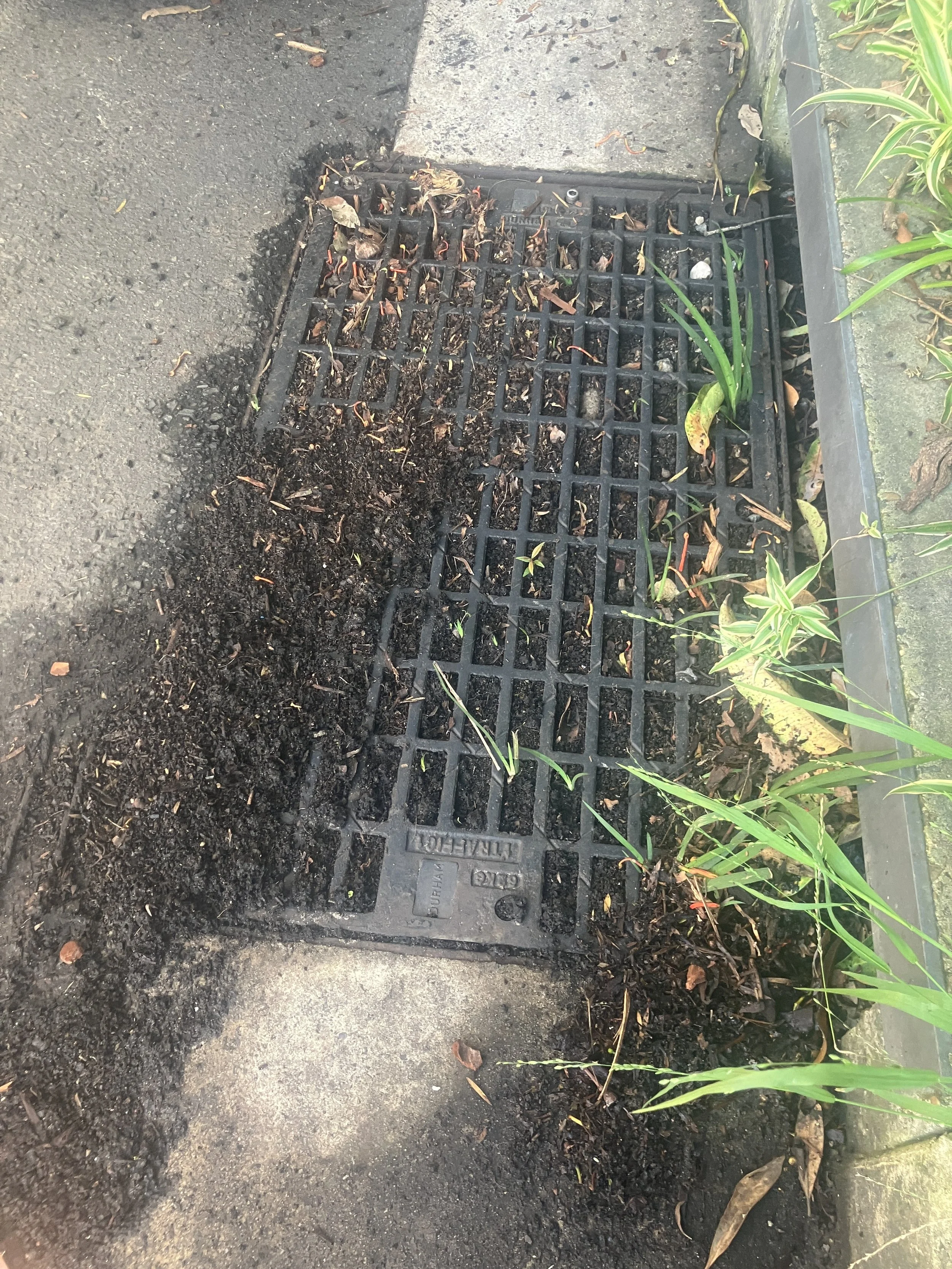 • Typical blocked stormwater pit in Myrtle Street, Chippendale, 24 March 2026.